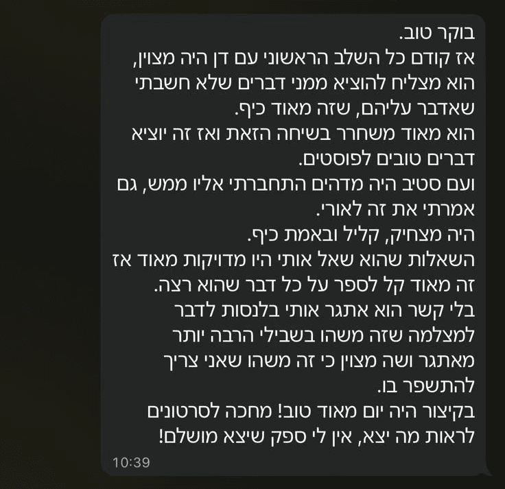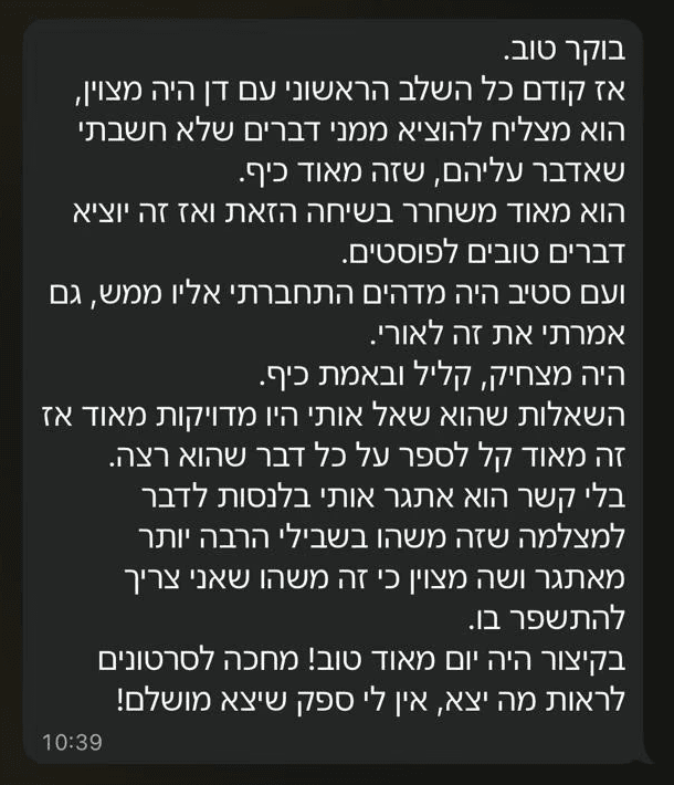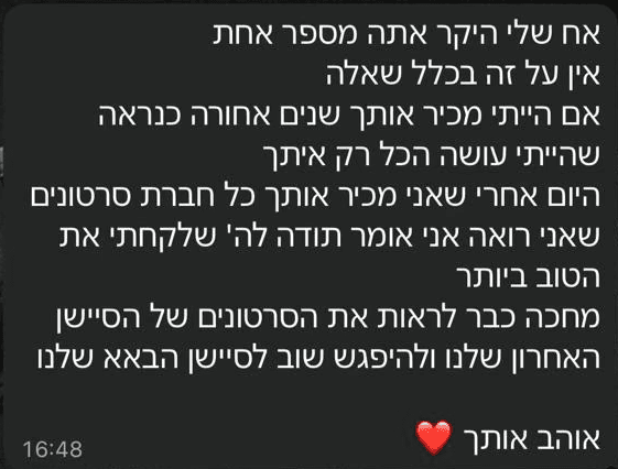 עברתי עם אלפי הפקות 3 ימי צילום (בנתיים) שכל אחד היה יותר טוב מהשני!! הקריאייטיב שעשו לי עזר לי בטירוף לדייק ולחשוב לעומק על המסרים שלי, והימי צילום עצמם היו ברמה הכי גבוהה שיש, באמת הוציאו ממני את ההכי טוב שלי עם מלא סבלנות ומקצועיות!