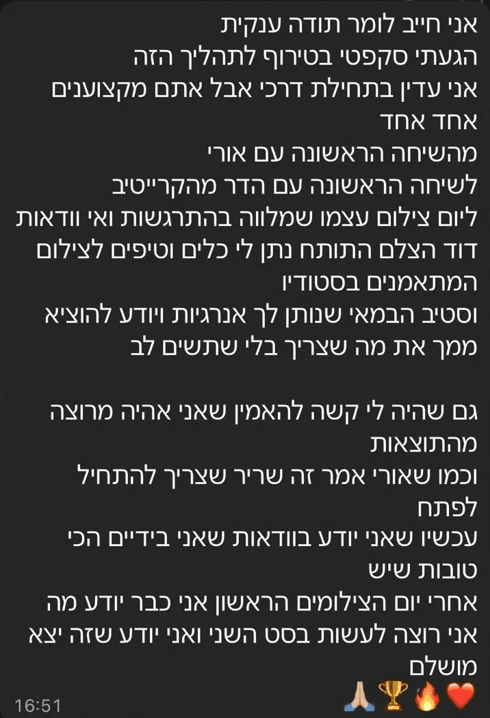 עברתי עם אלפי הפקות 3 ימי צילום (בנתיים) שכל אחד היה יותר טוב מהשני!! הקריאייטיב שעשו לי עזר לי בטירוף לדייק ולחשוב לעומק על המסרים שלי, והימי צילום עצמם היו ברמה הכי גבוהה שיש, באמת הוציאו ממני את ההכי טוב שלי עם מלא סבלנות ומקצועיות!